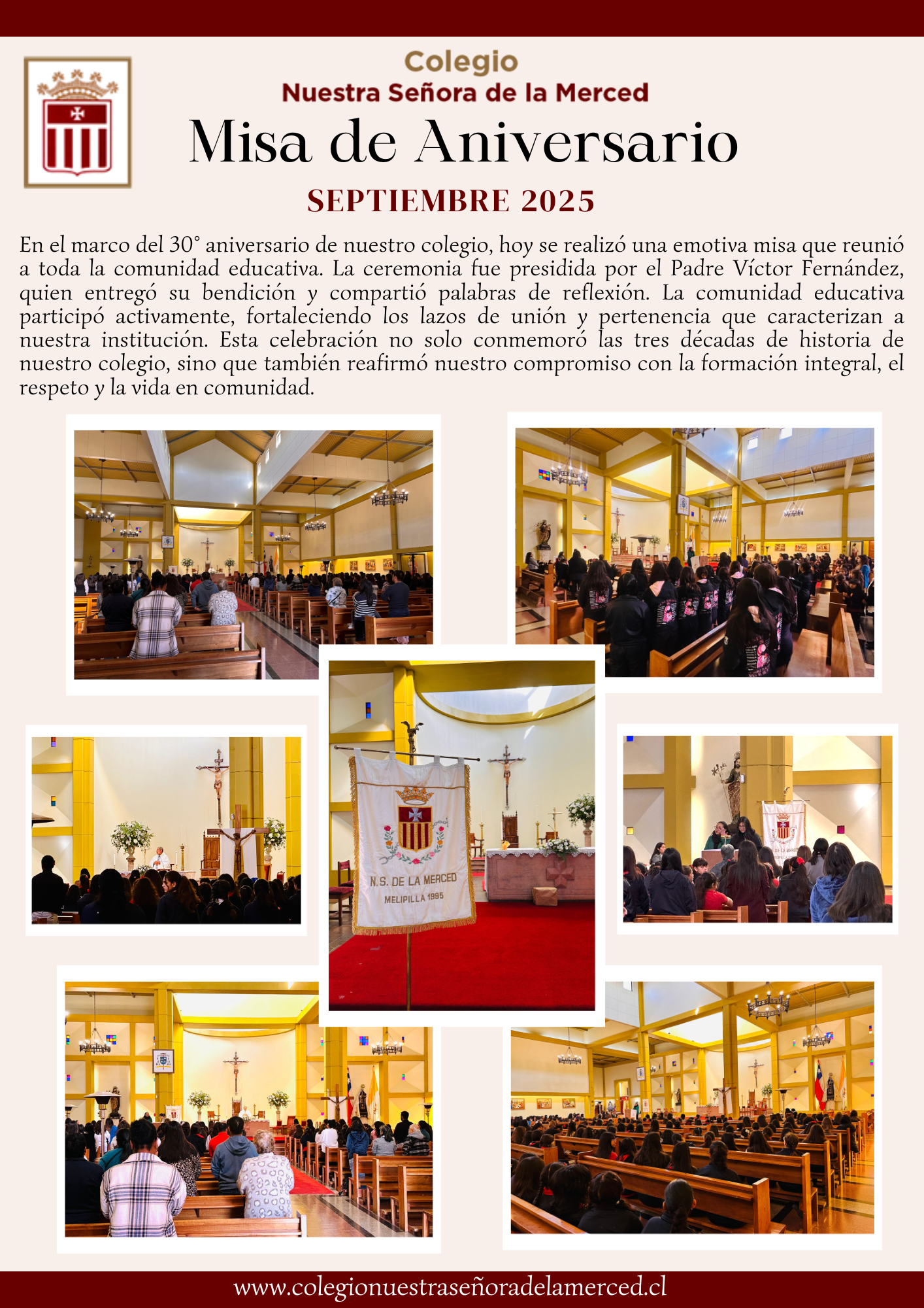 Este significativo encuentro nos permitió dar gracias a Dios por tres décadas de historia, de formación académica y humana, y de servicio educativo inspirado en los valores mercedarios. La presencia de nuestros estudiantes, apoderados, profesores y personal administrativo dio un marco especial a la celebración, reflejando la unidad y compromiso que caracteriza a nuestra comunidad.